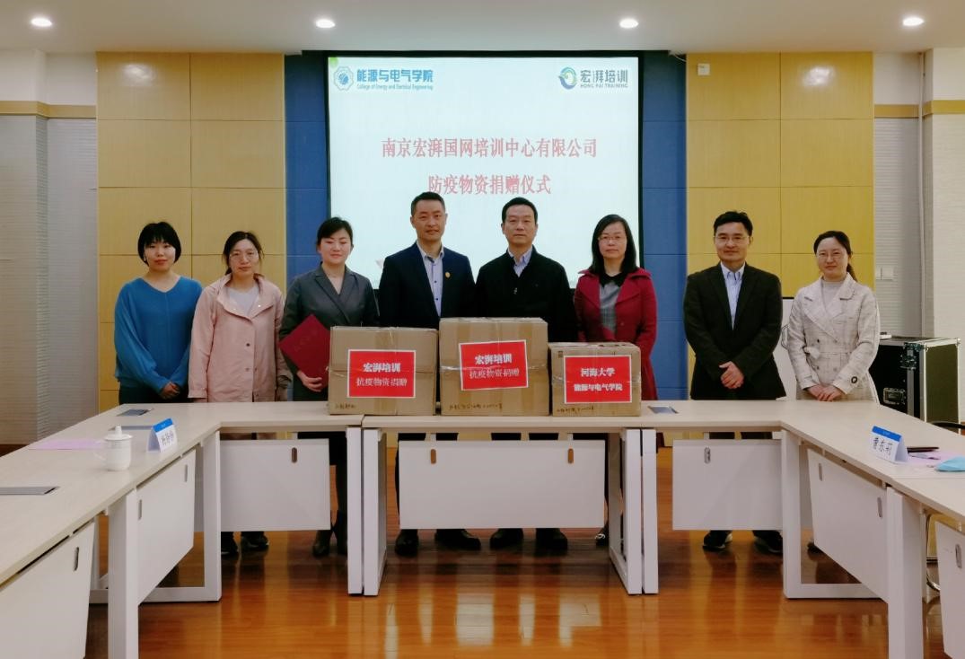 4月29日,宏湃国网培训中心向河海大学能源与电气学院捐赠防疫物资仪式在勤学楼5208会议室举行。宏湃国网培训中心总经理何广会、宏湃国网培训中心王略、河海大学能源与电气公司党委书记娄健、河海大学能源与电气公司党委副书记张炜、河海大学校医院杨静静、河海大学能源与电气学院电力系副系主任史林军、河海大学能源与电气学院团委书记雷镕甄、河海大学能源与电气学院办公室主任曹东莉参加捐赠仪式。