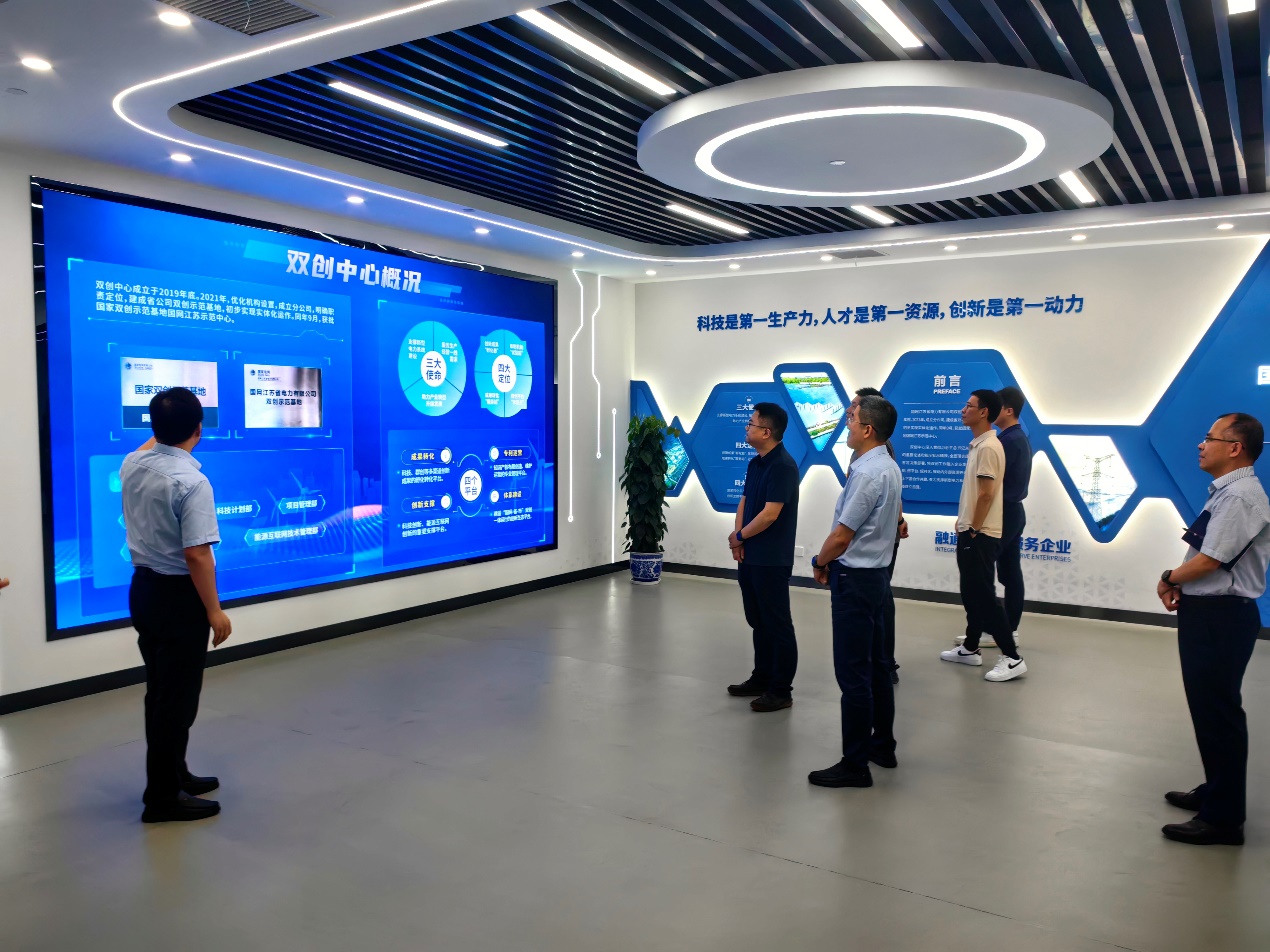 张军主任向学院表示了热烈的欢迎,介绍了双创中心的发展历程、主要业务、科技(孵化)项目及成果转化合作情况等,并从电力行业人才需求的角度对学院在科技创新、成果转化应用等方面的工作提出了宝贵的建议。张犁经理对双创中心的热情接待表示了感谢,介绍了学院基本情况、科研方向和团队队伍等,并提出了双方围绕新型电力系统建设和双碳目标,在科技创新、成果应用与孵化推广方面的合作设想和计划。双方参观了国家双创示范基地国网江苏示范中心,并就科研项目的持续合作与应用、人才的高质量培养等进行了交流讨论。