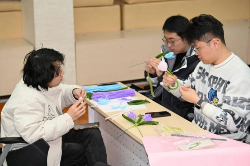 活动现场,同学们分组投入干花书签与扭扭棒手工制作。做干花书签的同学小心地夹起花瓣,轻轻铺在书签上,固定、系上流苏,每一步都很仔细。而扭扭棒制作则更为热闹,五颜六色的扭扭棒在手中扭转、缠绕。看似简单的绒条,在研究生们的巧思下,幻化出万千形态,每一种都饱含着同学们的真挚祝福。