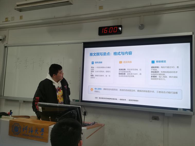 本次分享会聚焦推文写作与手机摄影两大核心技能,内容贴合员工工作实际需求,实用性满满。活动伊始,季子澄同学率先带来推文写作技巧分享,从推文的核心定义与特点出发,系统拆解活动预告、活动回顾、动员号召三类常用推文的写作逻辑与创作要点。他着重讲解了推文“开头点题、正文分点、结尾明指令”的结构搭建技巧,结合员工工作案例,分析了排版视觉、语言风格的优化方法,同时针对内容空洞、逻辑混乱、AI使用不当等常见问题,给出具体避坑解决方案,让大家清晰掌握打造优质活动推文的关键要点。